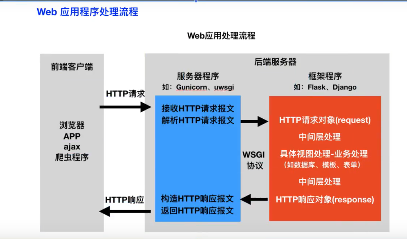 #场景 #:开发了几个应用后,发现每个应用都完成了从监听网络端口到建立连接、解析请求的参数、进行回应、发送 Response 数据包等等一系列的工作,每次都要在获取请求、解析请求、发送请求这些一成不变的步骤上花费大量时间,不如写个 Server 模块,把这些功能单独实现,以后再有新的需求,只需要考虑 Framework 部分即可,这样就可以避免 “重复造轮子” 了。当自己写好了一套 server 程序,隔壁老王听说你写了个 Server 程序很牛掰,想要借用一下你的代码。你本着开源精神将 Server 模块分享给他,可是,老王拿到代码一看就傻眼了 —— 天啊,你的 Server 部分的数据接口、函数调用方式和他自己写的 Framework 完全不搭,改动起来难度颇大,还不如自己再写一个 Server 来得方便。应该整一套接口规范出来,让老王在编写自己的 Framework 的时候就按照你设计的规范来写,这样写出来的程序才能够互相 “契合”,便于调试和使用。就是 WSGI(Python Web Server Gateway)